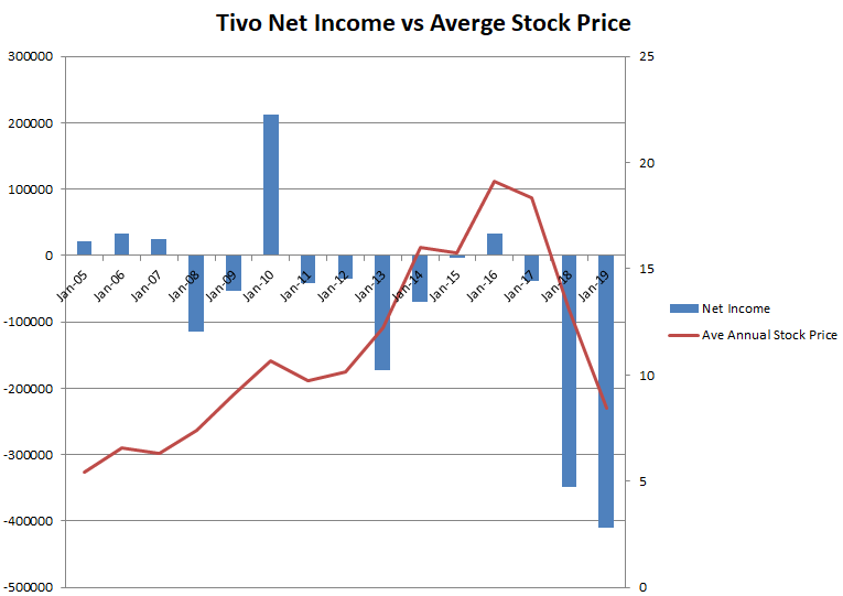 When you look at Tivo’s average annual stock price with their revenues, the stock price does seem to track reasonably well with the revenues, except for the significant downturn in 2018-2019.