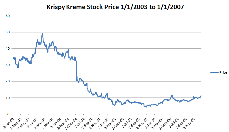 You start seeing your KKD stock go down, but because you have so much invested in KKD, you see this as a buying opportunity and buy more. KKD has given you so much profit you are committed to KKD even when the health-conscious public has said they want lower carb foods, and the company is warning of this change. What happened? You lost all your profit and your initial capital as the stock plummeted from highs of $48.92 on Aug 20, 2003, to a low of $4.05 on Oct 27, 2005.